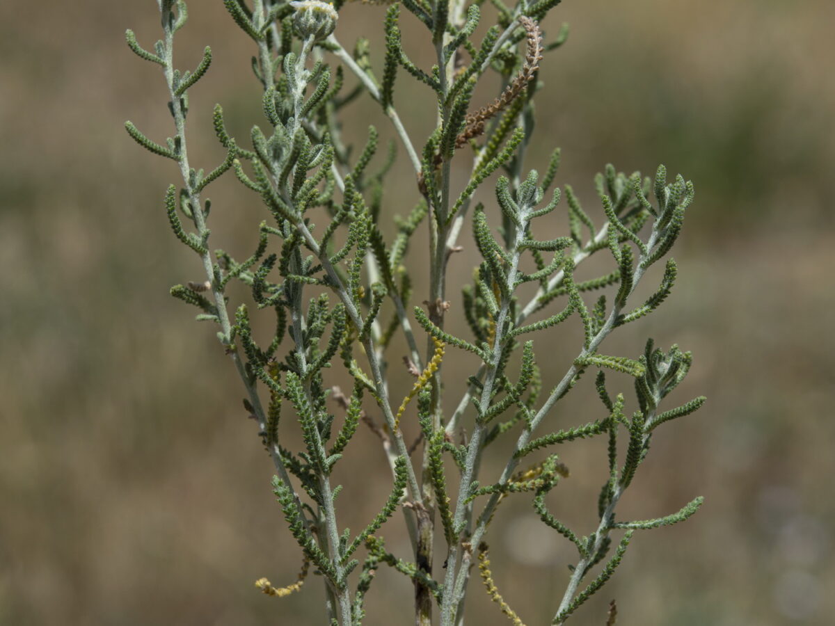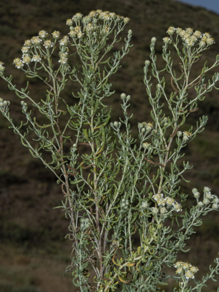 Mata leñosa, tomentosa. Tallos erectos, ramificados. Hojas 1–2,5 x 0,1–0,2 cm, alternas, lineares, pinnatipartidas o pinnatisectas, cilíndricas, con segmentos trilobados dispuestos en 4–5 filas. Capítulos 3,5–4 x 5–7 mm, radiados, en corimbos terminales laxos y paucifloros; brácteas involucrales coriáceas, aquilladas, tomentosas; receptáculo cónico, con brácteas interseminales parecidas a las involucrales. Flores amarillas, las externas hemiliguladas, femeninas, con limbo de 1–2 mm; las internas flosculosas, hermafroditas. Aquenios obovoideos, comprimidos, con 2 costillas laterales blanquecinas, sin vilano