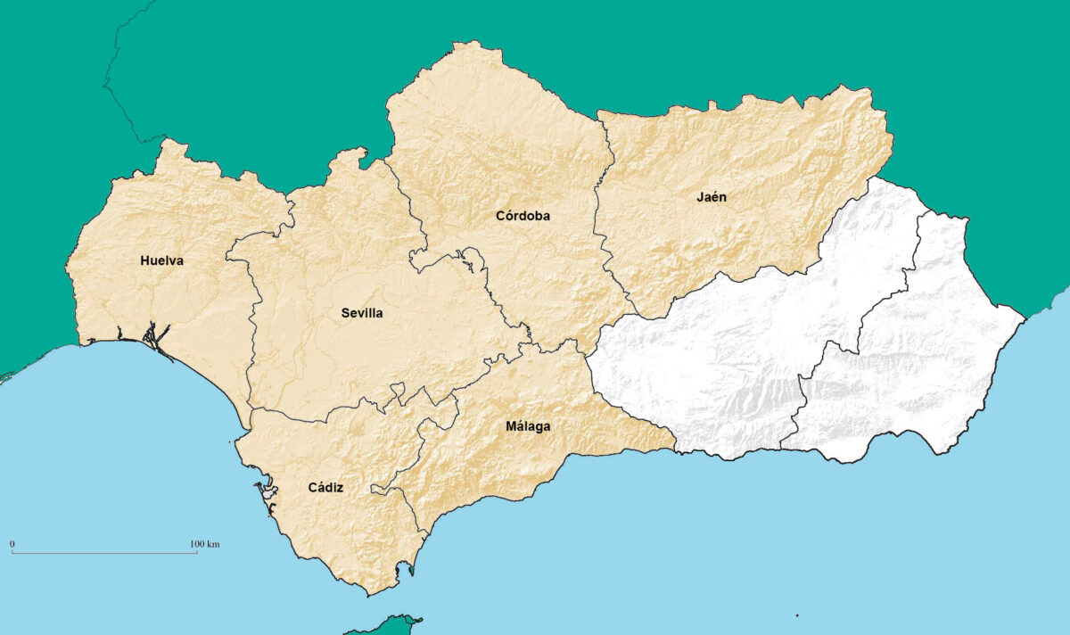 Cádiz, Córdoba, Huelva, Jaén, Málaga, Sevilla