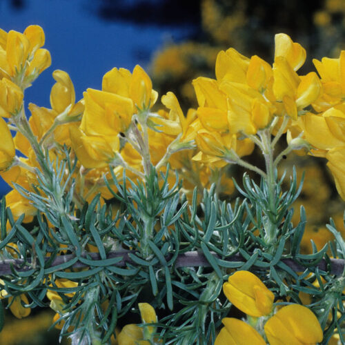 De color verde ceniciento, con tallo rígido, ramificado, que se descorteza en tiras longitudinales espontáneamente. Hojas trifolioladas, generalmente fasciculadas, estipuladas; folíolos 9–20 x 1–1,5(2,5) mm, revolutos, en apariencia lineares, seríceos por ambas caras, aunque menos por el haz. Inflorescencias en racimos ± densos, con menos de 10 flores papilionadas; bráctea hasta 5 mm, linear–lanceolada, caduca; bractéolas lineares, caducas; pedicelos 4,5–9 mm. Cáliz 5–8 mm, tomentoso–velutino, con pelos blancos o de tono acastañado, sin glándulas; labio inferior trífido, con dientes de 1–2 mm. Corola amarillo–dorada; estandarte 13–17 x 11–13 mm, de dorso seríceo; alas y quilla casi tan largas como el estandarte. Estambres 10, monadelfos. Legumbre hasta 60 x 10 mm, con glándulas estipitadas de color pardo oscuro, con 2–5 semillas