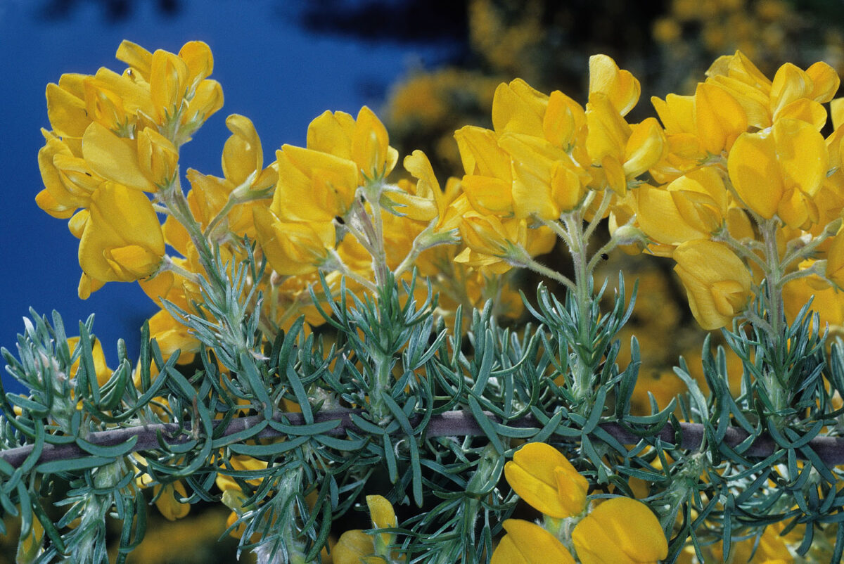 De color verde ceniciento, con tallo rígido, ramificado, que se descorteza en tiras longitudinales espontáneamente. Hojas trifolioladas, generalmente fasciculadas, estipuladas; folíolos 9–20 x 1–1,5(2,5) mm, revolutos, en apariencia lineares, seríceos por ambas caras, aunque menos por el haz. Inflorescencias en racimos ± densos, con menos de 10 flores papilionadas; bráctea hasta 5 mm, linear–lanceolada, caduca; bractéolas lineares, caducas; pedicelos 4,5–9 mm. Cáliz 5–8 mm, tomentoso–velutino, con pelos blancos o de tono acastañado, sin glándulas; labio inferior trífido, con dientes de 1–2 mm. Corola amarillo–dorada; estandarte 13–17 x 11–13 mm, de dorso seríceo; alas y quilla casi tan largas como el estandarte. Estambres 10, monadelfos. Legumbre hasta 60 x 10 mm, con glándulas estipitadas de color pardo oscuro, con 2–5 semillas