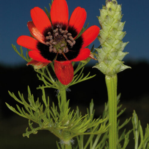 Tallos simples o ramificados en la parte superior, vellosos sobre todo en la base. Hojas alternas, bi–tripinnatisectas, con lóbulos lineares, las inferiores pecioladas, vellosas, las superiores sésiles. Flores 1,2–3(3,6) cm de diámetro, actinomorfas, hermafroditas, solitarias, terminales; sépalos de longitud 1/2–2/3 de la de los pétalos, pelosos; pétalos 7–8, de 6–15 x 3–7 mm, obovados, rojos o amarillos, con mancha oscura en la base; estambres numerosos, de anteras negro–violáceas; gineceo apocárpico, súpero. Fruto poliaquenio, espiciforme, denso; aquenios con la base casi tan ancha como la parte media, cresta transversal manifiesta y borde superior con pico largo, alejado de la giba