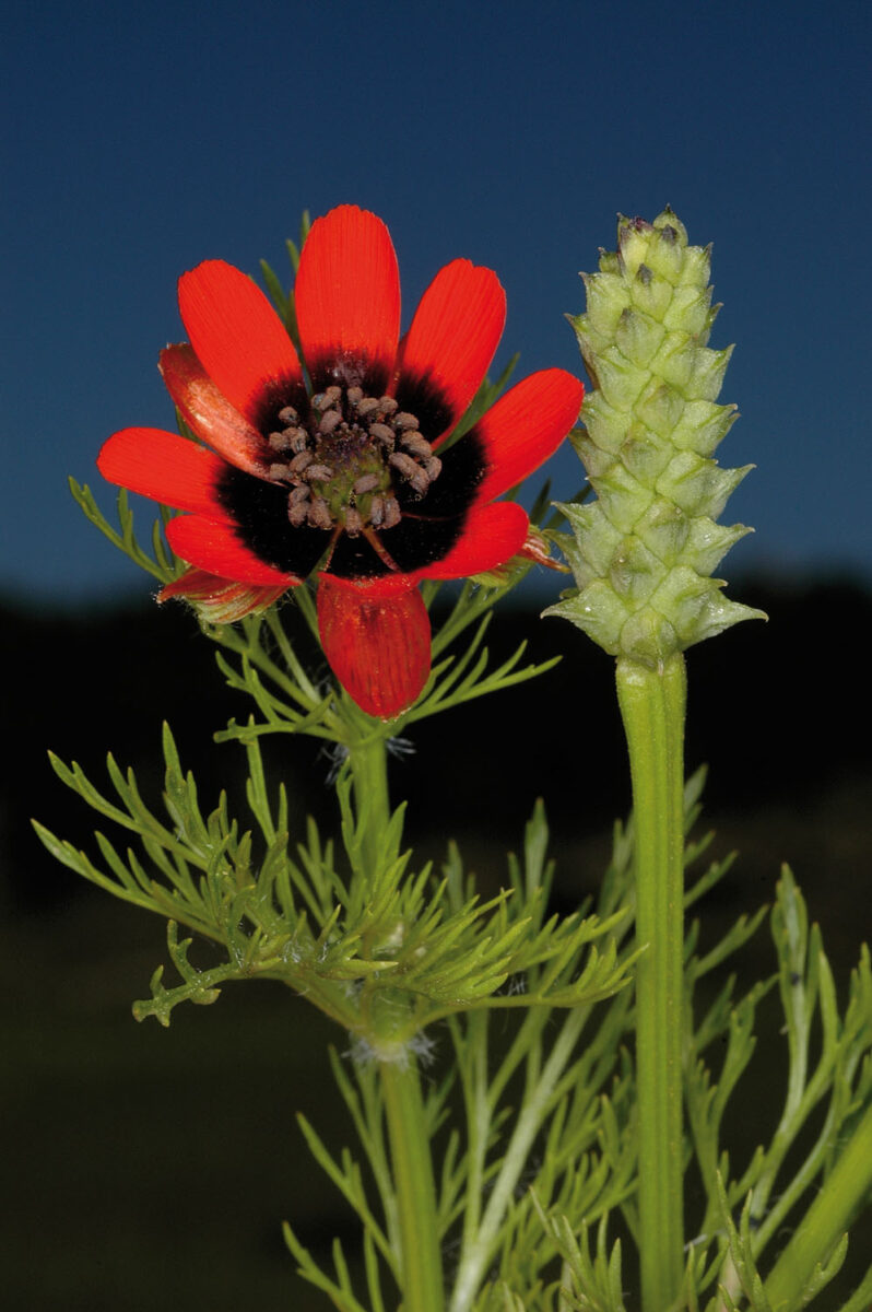 Tallos simples o ramificados en la parte superior, vellosos sobre todo en la base. Hojas alternas, bi–tripinnatisectas, con lóbulos lineares, las inferiores pecioladas, vellosas, las superiores sésiles. Flores 1,2–3(3,6) cm de diámetro, actinomorfas, hermafroditas, solitarias, terminales; sépalos de longitud 1/2–2/3 de la de los pétalos, pelosos; pétalos 7–8, de 6–15 x 3–7 mm, obovados, rojos o amarillos, con mancha oscura en la base; estambres numerosos, de anteras negro–violáceas; gineceo apocárpico, súpero. Fruto poliaquenio, espiciforme, denso; aquenios con la base casi tan ancha como la parte media, cresta transversal manifiesta y borde superior con pico largo, alejado de la giba