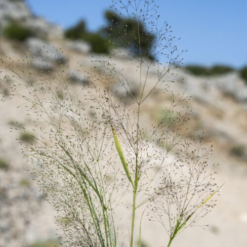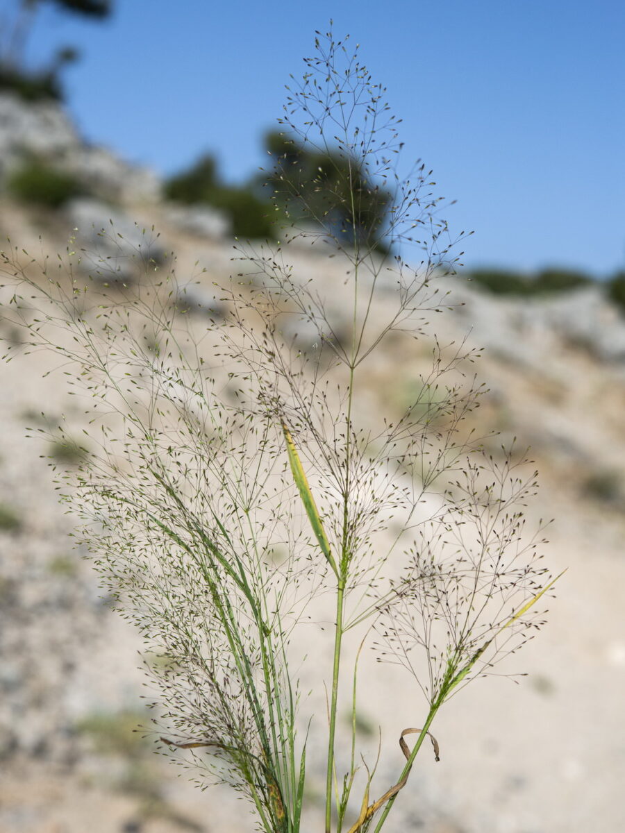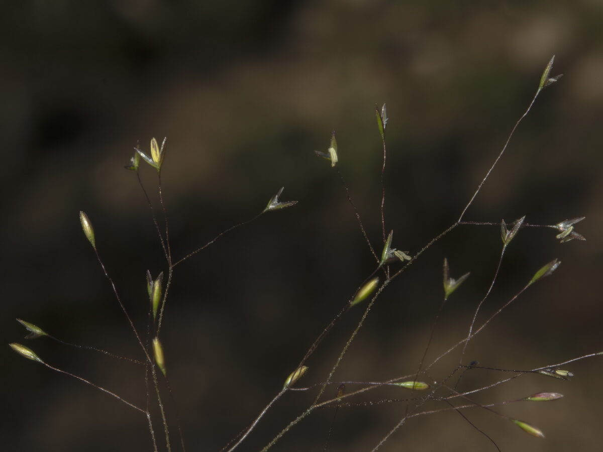 Tallos acodados en la base. Lámina de las hojas 1–10 cm, plana o a veces conduplicada, aculeolada; lígula 1–7 mm, aguda, dentada o lacerada. Panícula 5–50 cm, difusa y de contorno oval; ramas capilares, divaricadas, aculeoladas, 7–15 en el nudo inferior, con las espiguillas localizadas en el ½–1/3 superior. Espiguillas 1–1,5 mm, unifloras; pedúnculos claviformes y casi lisos de 1,5–2 veces más largos que anchos; glumas subiguales, obtusas, uninervadas; callo glabro; lema c. 0,4 mm, c. 1/3 de la longitud de las glumas, trapezoidal, denticulado, mútico; pálea bicarinada, un poco más larga que el lema. Anteras c. 1mm