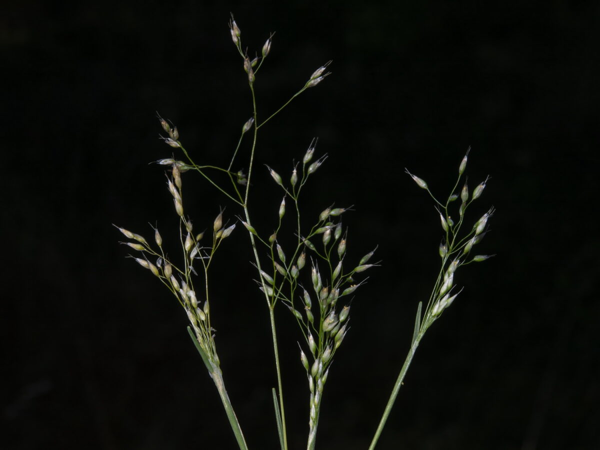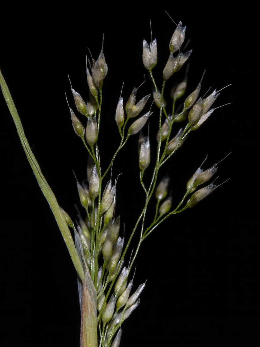 Lámina de las hojas 1–7,5 cm; lígula 2–5 mm. Panícula 1,2–8 cm, laxa. Espiguillas 1,8–2,3 mm, con 2 flores; pedúnculos 0,8–3,5 mm, de hasta el doble de la longitud de las espiguillas, con un anillo apical; glumas subiguales, escariosas, obtusas, con el borde dentado, a veces mucronadas; callo glabro; lema 2/3 de la longitud de las glumas, con arista de 1,6–2,5 mm, presente en ambas flores. Anteras c. 0,2 mm. Cariopsis c. 1 mm, parda