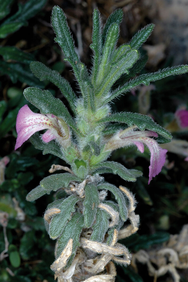 Tallos blanquecino–grisáceos, vilosos o tomentosos. Hojas 14–35 x 3–6 mm, oblongas, oblongo–lineares u oblongo–espatuladas, obtusas, enteras, dentadas o lobuladas en el tercio superior, rara vez desde la mitad, planas o revolutas. Inflorescencia en verticilastros de 2–4 flores, con brácteas foliáceas. Flores zigomorfas, hermafroditas, pentámeras, sésiles. Cáliz 3,5–4,5 mm, con 5 dientes subiguales, tan largos o más cortos que el tubo. Corola 12–20 mm, bilabiada, rosado-púrpurea, con el tubo exerto, labio superior muy reducido y labio inferior trilobado, con un anillo de pelos en el interior del tubo. Estambres didínamos, exertos