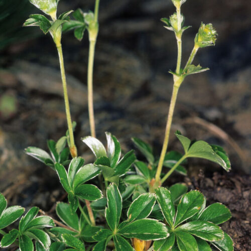 Herbácea perenne, sufruticosa, tapizante. Tallos fértiles ± erectos, recubiertos de pelos seríceos y aplicados, verdes, rara vez teñidos de púrpura. Hojas basales 2–4 cm, rosuladas, palmatisectas, de contorno semicircular, reniforme o circular, algo infundibuliforme, con 5(7) segmentos de ápice redondeado. Inflorescencia estrecha, con inflorescencias parciales esféricas y densas de monocasios; todas las flores bracteadas o raramente alguna sin ellas; pedicelos de las flores no terminales de 0,3–2 mm. Flores actinomorfas, hermafroditas, apétalas, con calículo. Fruto en aquenio, de 1–1,5 mm, algo rostrado, incluido en el receptáculo