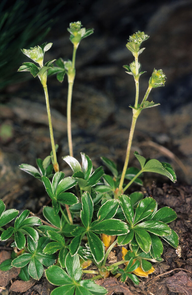 Herbácea perenne, sufruticosa, tapizante. Tallos fértiles ± erectos, recubiertos de pelos seríceos y aplicados, verdes, rara vez teñidos de púrpura. Hojas basales 2–4 cm, rosuladas, palmatisectas, de contorno semicircular, reniforme o circular, algo infundibuliforme, con 5(7) segmentos de ápice redondeado. Inflorescencia estrecha, con inflorescencias parciales esféricas y densas de monocasios; todas las flores bracteadas o raramente alguna sin ellas; pedicelos de las flores no terminales de 0,3–2 mm. Flores actinomorfas, hermafroditas, apétalas, con calículo. Fruto en aquenio, de 1–1,5 mm, algo rostrado, incluido en el receptáculo