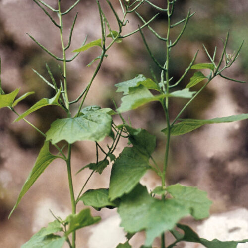 Bienal, rara vez anual, erecta, generalmente unicaule, con frecuencia ramificada en la parte superior, vilosa en la base, con intenso olor a ajo al frotarla. Hojas 1–18 x 0,8–11 cm, las inferiores cordado–reniformes o cordadas, con pecíolo muy largo y peloso, las superiores cordiformes, triangulares o rómbicas, todas desigualmente sinuado–dentadas, con algún pelo en los nervios del envés o glabras. Racimos con 10–30 flores, corimbiformes en la antesis y alargados en la fructificación, ebracteados. Flores actinomorfas, hermafroditas, tetrámeras; sépalos 2–3 mm, caducos, erecto–patentes, oblongos, no gibosos, blanquecinos, verdosos o algo violáceos; pétalos 2,5–6 mm, oblongo–lanceolados, blancos; estambres 6, tetradínamos; ovario súpero. Frutos en silicua, de 10–75 x 1–2,5 mm, erectos o erecto–patentes, lineares, algo torulosos, de sección subtetragonal, con nervio central más prominente; estilo corto; pedicelos 2,5–15 mm, erecto–patentes