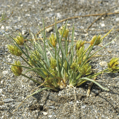 Lámina de las hojas 0,5–4 cm, que sobrepasa a la inflorescencia, plana, escábrida; lígula 1–2 mm. Inflorescencia 8–12 mm, subglobosa. Espiguillas 8–12 mm, sésiles o subsésiles, comprimidas lateralmente, con 11–17 flores; glumas 4,5–5,5 mm, subiguales, ovadas, con margen escarioso, uninervadas; lemas 4–4,5 mm, anchamente ovados, mucronados y con margen escarioso, 5–nervados; pálea de la misma longitud que el lema, lanceolada, estrecha. Anteras 0,5–0,9 mm; estigmas con estilopodio largo. Cariopsis 1,4–1,8 mm