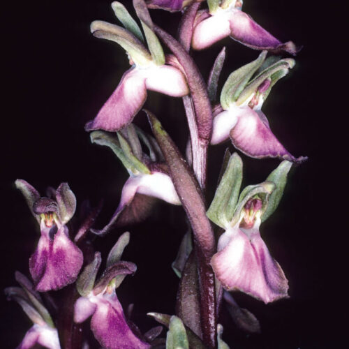 Tubérculos 2, indivisos, sésiles o subsésiles. Hojas basales 1–9 x 1,2–3 cm, formando roseta, anchamente lanceoladas, agudas. Inflorescencia 4–9 cm, subcilíndrica, densa; brácteas inferiores más largas que el ovario, lanceoladas, agudas, membranáceas, pardo violáceas. Flores sésiles, violáceas. Sépalos laterales de 2,3–4 mm de anchura, libres, lanceolados, asimétricos en la base, ± obtusos, pardo violáceos. Pétalos laterales lanceolados, obtusos, pardo violáceos. Labelo 8–12 x 7,4–12 mm, indiviso, flabelado, subentero o crenulado, violáceo; espolón 4,5–8 x 3–5 mm, sacciforme, obtuso, algo arqueado hacia abajo, blanco o ligeramente rosado. Fruto cápsula, erecto, con 6 costillas
