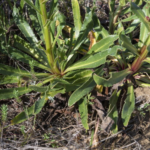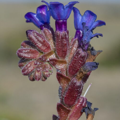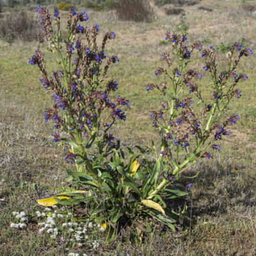 Uni o multicaule. Tallos ramificados en la parte superior, glabros o laxamente setoso en la parte superior, con setas de hasta 1´5(2) mm. Hojas inferiores del tallo gruesas, coriáceas, con pústulas apenas aculeadas; las inferiores hasta 11 x 2 cm, de estrechamente oblongas a lanceoladas, enteras o sinuado–dentadas; las caulinares de hasta 7 cm. Brácteas ligeramente más largas que los pedicelos, ovadas, decurrentes. Flores actinomorfas, hermafroditas, pentámeras. Cáliz 5,5–7,5 mm, alargándose hasta 10 mm en la fructificación, dividido hasta cerca de la mitad, con lóbulos obtusos y pelos cortos y aplicados. Corola hipocrateriforme, azul–violeta o violeta–purpúrea, con tubo de 6–7 mm, generalmente tan largo como el cáliz, y limbo de 7–11 mm de diámetro, con escamas pelosas desarrolladas en la garganta. Estambres exertos. Núculas 2,5–3 x 1,5–2 mm, transversalmente ovoideas, ligeramente tuberculadas, grises, con anillo basal