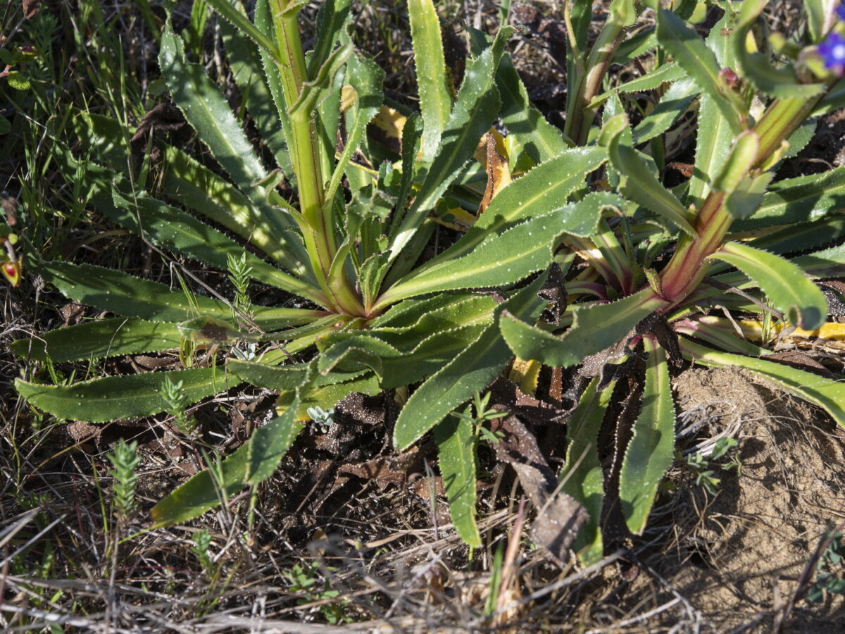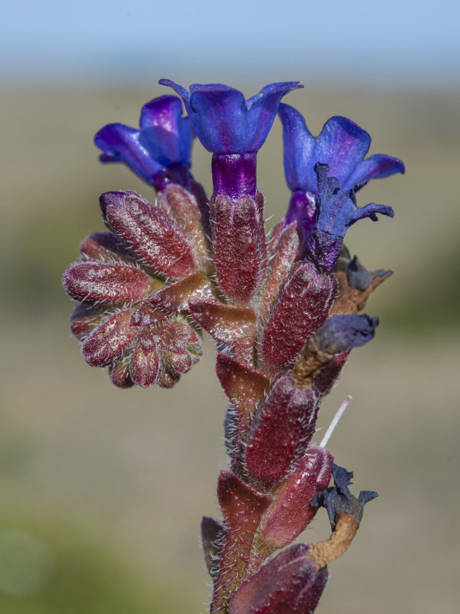 Uni o multicaule. Tallos ramificados en la parte superior, glabros o laxamente setoso en la parte superior, con setas de hasta 1´5(2) mm. Hojas inferiores del tallo gruesas, coriáceas, con pústulas apenas aculeadas; las inferiores hasta 11 x 2 cm, de estrechamente oblongas a lanceoladas, enteras o sinuado–dentadas; las caulinares de hasta 7 cm. Brácteas ligeramente más largas que los pedicelos, ovadas, decurrentes. Flores actinomorfas, hermafroditas, pentámeras. Cáliz 5,5–7,5 mm, alargándose hasta 10 mm en la fructificación, dividido hasta cerca de la mitad, con lóbulos obtusos y pelos cortos y aplicados. Corola hipocrateriforme, azul–violeta o violeta–purpúrea, con tubo de 6–7 mm, generalmente tan largo como el cáliz, y limbo de 7–11 mm de diámetro, con escamas pelosas desarrolladas en la garganta. Estambres exertos. Núculas 2,5–3 x 1,5–2 mm, transversalmente ovoideas, ligeramente tuberculadas, grises, con anillo basal