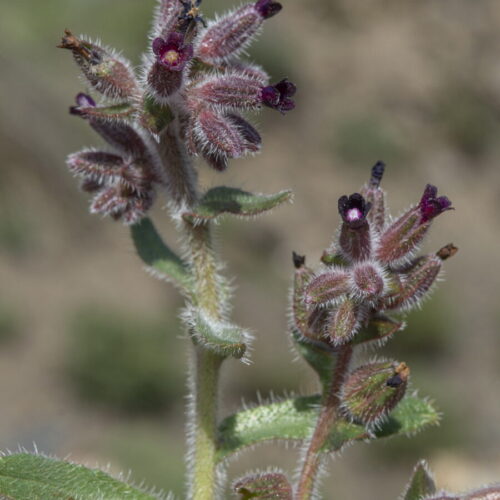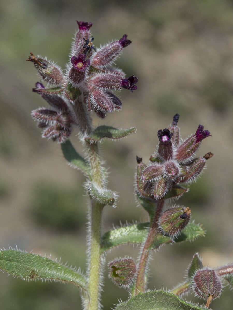 Híspida, uni o multicaule. Hojas de onduladas a casi enteras, con Indumento simple de setas rígidas de base tuberculada ± desiguales; las inferiores 6–15(20) x 1–2 cm, oblanceoladas; las caulinares hasta 7(10) x 1,5(2,5) mm, de lineares a oblanceoladas. Flores actinomorfas, hermafroditas, pentámeras. Cáliz alargándose hasta 13(15) mm en la fructificación, dividido hasta más de la mitad en lóbulos obtusos o subagudos, híspido. Corola hipocrateriforme, azul, violeta o purpúrea, con tubo de 5,5–10 mm, generalmente más largo que el cáliz y limbo de 5–10 mm de diámetro, con escamas pelosas desarrolladas en la garganta. Estambres exertos. Pedicelos fructíferos recurvados. Núculas 2–3,5 x 3–4 mm, transversalmente ovoideas, finamente tuberculadas, grises, con anillo basal