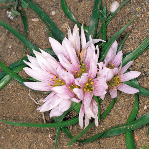 Tuberobulbo 2–3,5 x 1–2,5 cm, simple ó 2–3 superpuestos, con túnicas coriáceas, pardo oscuras. Tallo (1)4–8(12) x 0,1–0,4 cm, subterráneo, envuelto por una espata cilíndrica, membranácea. Hojas 4–9(13), de 4–8(11) x (0,2)0,3–0,6(0,8) cm, formando una roseta en el ápice del tallo, simples, enteras, paralelinervias, lineares o linear–lanceoladas, glabras. Flores 1–6, en umbela muy contraída, cortamente pediceladas, actinomorfas, hermafroditas, trímeras; tépalos 6, libres, con limbo de 1,5–3 x 0,3–0,7 cm, elíptico u oblanceolado, c. 2 veces más largo que la uña, acuminado, blanco o rosado con venas violetas; estambres 6, con anteras de 1–1,5 mm, dorsifijas, amarillas; ovario súpero con 3 estilos libres. Cápsula 6–8 mm, subglobosa, glandulosa