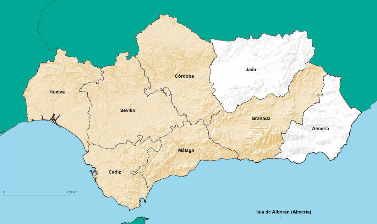 Cádiz, Córdoba, Granada, Huelva, Málaga, Sevilla