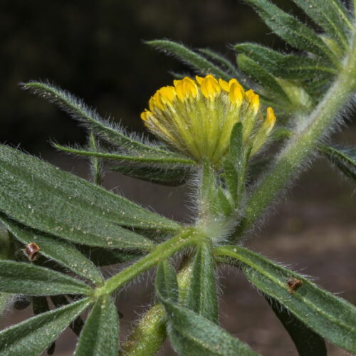 Tallos pelosos. Hojas basales con 3–5 folíolos, el terminal más grande, oblanceolado o espatulado; las caulinares imparipinnadas, con 9–11(13) folíolos, elípticos u oblongos. Glomérulos axilares, con 12–20(25) flores; pedúnculo 2–6 cm; bráctea 3–5–pinnatisecta, más larga que las flores. Flores hasta 13 mm, papilionadas. Cáliz 8–10 x c. 2 mm, tubular, incurvo, con pelos patentes en la cara ventral y adpresos en la dorsal, nada o poco acrescente. Corola poco más larga que el cáliz, amarilla; estandarte 4–4,5 x c. 3 mm, deltoide; quilla tan larga como las alas, aguda. Androceo diadelfo. Ovario glabro. Legumbre falciforme, con apículo subulado de 8–10 mm, muy exerta, glabra, en general monosperma, por excepción disperma
