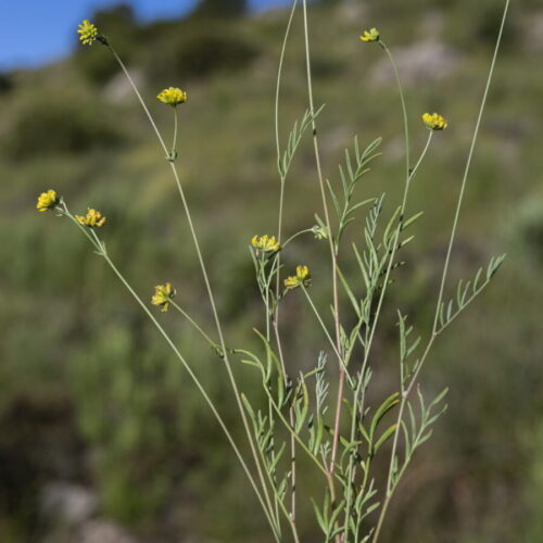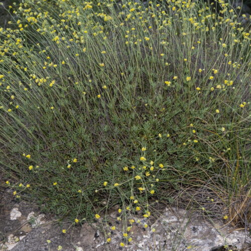 Tallos erectos, rígidos, subafilos en la mitad superior, con pubescencia adpresa. Hojas inferiores imparipinnadas, con 5–13 folíolos de 6–14 x 1–2(2,5) mm, subiguales, lineares u oblongos, involutos, aguzados en el ápice, de haz glabro y envés pubérulo; las superiores 5–palmatisectas. Glomérulos 10–14 mm, con 15–20 flores; bráctea 3–palmatisecta, tan larga o más corta que las flores; pedúnculo 10–45(60) mm. Flores 4–5 mm, papilionadas. Cáliz (2,5)3–4 mm, acampanado, adpreso–pubescente; dientes c. 1 mm, iguales, subulados. Corola amarilla; estandarte con lámina c. 3 x 2 mm, oblonga, truncada en la base; alas más cortas que la quilla. Androceo submonadelfo. Legumbre 3–4 x 1,5 mm, elipsoide, poco más larga que el cáliz, reticulada, con apículo subterminal. Semillas 1,7–2 mm, elipsoideas