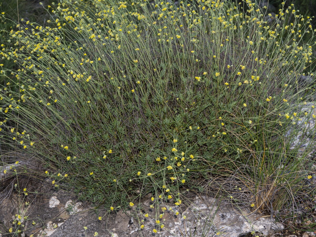 Tallos erectos, rígidos, subafilos en la mitad superior, con pubescencia adpresa. Hojas inferiores imparipinnadas, con 5–13 folíolos de 6–14 x 1–2(2,5) mm, subiguales, lineares u oblongos, involutos, aguzados en el ápice, de haz glabro y envés pubérulo; las superiores 5–palmatisectas. Glomérulos 10–14 mm, con 15–20 flores; bráctea 3–palmatisecta, tan larga o más corta que las flores; pedúnculo 10–45(60) mm. Flores 4–5 mm, papilionadas. Cáliz (2,5)3–4 mm, acampanado, adpreso–pubescente; dientes c. 1 mm, iguales, subulados. Corola amarilla; estandarte con lámina c. 3 x 2 mm, oblonga, truncada en la base; alas más cortas que la quilla. Androceo submonadelfo. Legumbre 3–4 x 1,5 mm, elipsoide, poco más larga que el cáliz, reticulada, con apículo subterminal. Semillas 1,7–2 mm, elipsoideas