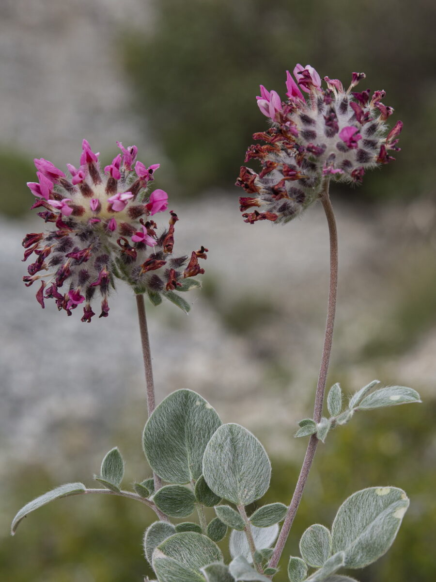 Tallos erectos o ascendentes, adpreso-pubescentes o seríceos en toda su longitud, raramente glabrescentes en la base, o hirsuto-vilososal menos en la base. Hojas basales apiñadas o no, con 1–7 folíolos, el terminal al menos el doble de largo que los laterales, (ocasionalmente único) de orbicular a ampliamente ovado, con indumento en general sedoso, viloso–seríceo por ambas caras. Glomérulos 15–35 mm, con 15–25 flores; bráctea 3–7–palmatipartida, digitada. Flores 12–18 mm, papilionadas, pediceladas o subsésiles. Cáliz 7–17 mm, ± tubular en el botón floral, ovoide e hinchado en la antesis, giboso, subbilabiado, con indumento variable, concoloro o purpúreo en el ápice; dientes mucho más cortos que el tubo, desiguales, los superiores triangulares, los inferiores ± subulados. Corola con estandarte y alas rosados, purpúreos o amarillos –raramente blanquecinos– y quilla atropurpúrea. Androceo submonadelfo. Legumbre 3,5–7 x 2–3 mm, hemiescuteliforme, gibosa en la base, glabra, con estípite de 1–3 mm. Semillas 3–4 mm