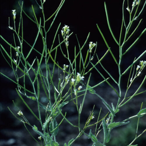 Uno o varios tallos erectos, simples, a veces ramificados, pubescentes, con pelos de 2–4 brazos, sobre todo en la parte inferior, glabrescentes en la superior. Hojas basales atenuadas en pecíolo, oblanceoladas o espatuladas, caducas; las caulinares 7–8, de 0,4–3(3,7) x 0,2–1,8(2) cm, sésiles, ovadas o elípticas, sagitadas, con aurículas agudas y margen denticulado, todas con indumento similar al del tallo. Racimo ebracteado, generalmente con eje zigzagueante en la fructificación. Flores actinomorfas, hermafroditas, tetrámeras; sépalos 1,5–2 mm, los laterales gibosos en la base; pétalos 2,8–4 mm, con uña manifiesta, blancos; estambres 6, tetradínamos; ovario súpero, con numerosos primordios por lóculo. Frutos en silicua, de 18–38 x 0,8–1 mm, lineares, algo torulosos en la madurez; valvas con nervio medio marcado, glabras o pubescentes; pedicelos 1,5–5(8) mm, erectos o erecto–patentes, ligeramente más delgados que el fruto; estilo 0,3–0,4 mm. Semillas ápteras, de color marrón claro