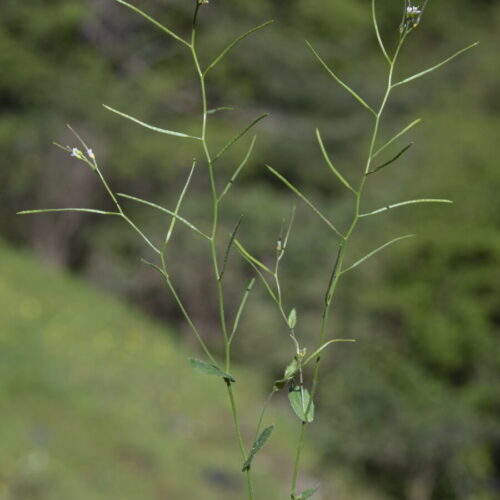 Uno o varios tallos erectos, simples o ramificados en la mitad superior, con pelos ramificados, sobre todo en la base. Hojas basales 3,5–4,5 x 1,5–2 cm, gradualmente estrechadas en el pecíolo, oblanceoladas o espatuladas, crenadas, caducas; las caulinares 3–13, de 1,5–2,5 x 0,5–1,3 cm, sésiles, ovadas, sagitadas o auriculadas en la base, dentadas, todas con indumento similar al del tallo. Racimo ebracteado, que se alarga mucho en la fructificación. Flores actinomorfas, hermafroditas, tetrámeras; sépalos 1,2–3 mm, los laterales gibosos en la base; pétalos 2,5–5 mm, con uña manifiesta, blancos; estambres 6, tetradínamos; ovario súpero, con numerosos primordios por lóculo. Frutos en silicua, de 40–45 mm, lineares, casi planos, glabros; pedicelos (5)6–15 mm, erectos o erecto–patentes, más delgados que el fruto; estilo 0,3–0,4 mm. Frutos 41-52 mm. Semillas con ala estrecha, negruzcas
