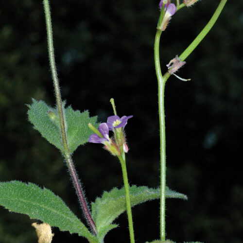Uno o varios tallos, simples o ramificados, erectos o ascendentes, pubescentes sobre todo en la mitad inferior, con pelos ramificados y simples, glabrescentes en la parte superior. Hojas basales 3,5–5,5(7,5) x 0,8–1,8(2) cm, gradualmente estrechadas en el pecíolo, oblanceoladas, dentadas o subenteras; las caulinares 1,2–4(5,5) x 0,5–2(4,5) cm, poco numerosas, sésiles, anchamente ovadas o subcordadas, dentadas, todas con indumento semejante al del tallo. Racimo ebracteado, paucifloro, por lo general con menos de 5 flores. Flores actinomorfas, hermafroditas, tetrámeras; sépalos 3,8–6 mm, erectos, los laterales ligeramente gibosos en la base, pelosos; pétalos 6–10 mm, con uña manifiesta, azul–violetas; estambres 6, tetradínamos; ovario súpero, con numerosos primordios por lóculo. Frutos en silicua, de 35–60 mm, con valvas coriáceas, oscuras, con nervio medio marcado, acompañado de nervios longitudinales anastomosados; pedicelos 1–5(10) mm, casi tan anchos como el fruto, erectos o erecto–patentes; estilo 0,5–0,8 mm. Semillas elipsoides, negruzcas
