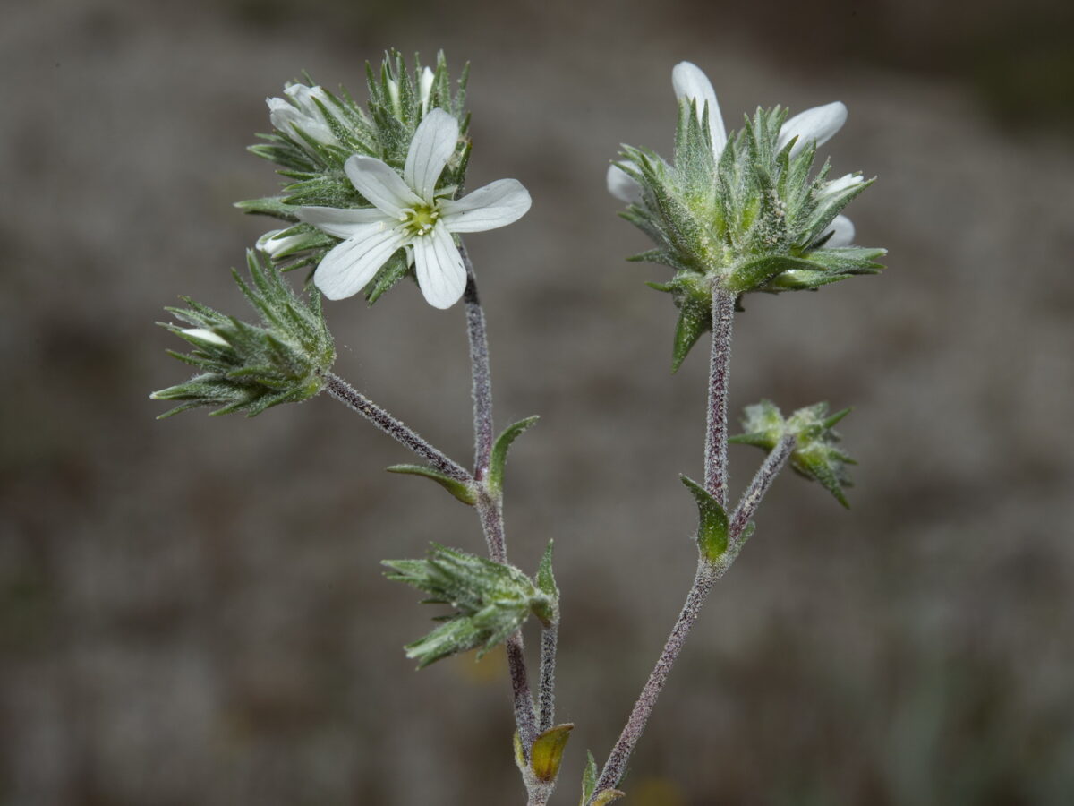 Cepa leñosa muy ramificada. Tallos ramificados, ascendentes, gráciles, los floridos con entrenudos más largos que las hojas, pubescente-vellosos. Hojas 2–4 x 0,5–1,5 mm, opuestas, connadas, imbricadas, ovadas u oblongo–lanceoladas, subobtusas, trinervadas, con los nervios marginales formando un reborde grueso, vellosas en el ápice, ciliadas en la base. Brácteas vellosas o flocos-tomentosas. Flores en glomérulos de 3–10, axilares o terminales, sobre largos pedúnculos, actinomorfas, hermafroditas, pentámeras. Sépalos 4–6 mm, ovado–lanceolados, sin mucrón, con ancho margen escarioso ciliado, glabros, pubescentes o flocoso–lanuginosos. Pétalos más largos que los sépalos, enteros, blancos. Estilos 3. Cápsula ligeramente exerta, ovoidea, con 6 dientes. Semillas reniformes, tuberculadas, negras