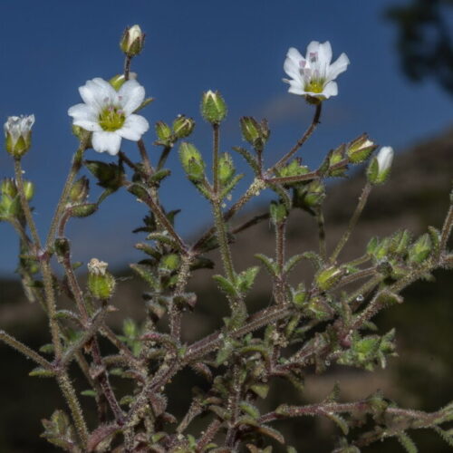 Tallos ramificados, pubescentes en la base, pubescente–glandulosos en el resto. Hojas 3–10 x 2–3,5 mm, opuestas, connadas, con fascículos axilares, ovadas, ovado–lanceoladas o elípticas, uninervadas, algo crasas, pubescentes, ciliadas en la base, las basales subespatuladas. Cimas de dicasios compuestos; pedicelos hasta 25 mm en la fructificación, pubescente–glandulosos. Flores actinomorfas, hermafroditas, pentámeras. Sépalos 3–5 mm, ovado–lanceolados, con 3–7 nervios, pubescentes, con algunos pelos glandulíferos, los externos herbáceos, los internos con ancho margen escarioso. Pétalos más largos que los sépalos, emarginados, blancos. Estilos 3. Cápsula exerta, oblongoidea, con 6 dientes. Semillas reniformes, tuberculadas, negras