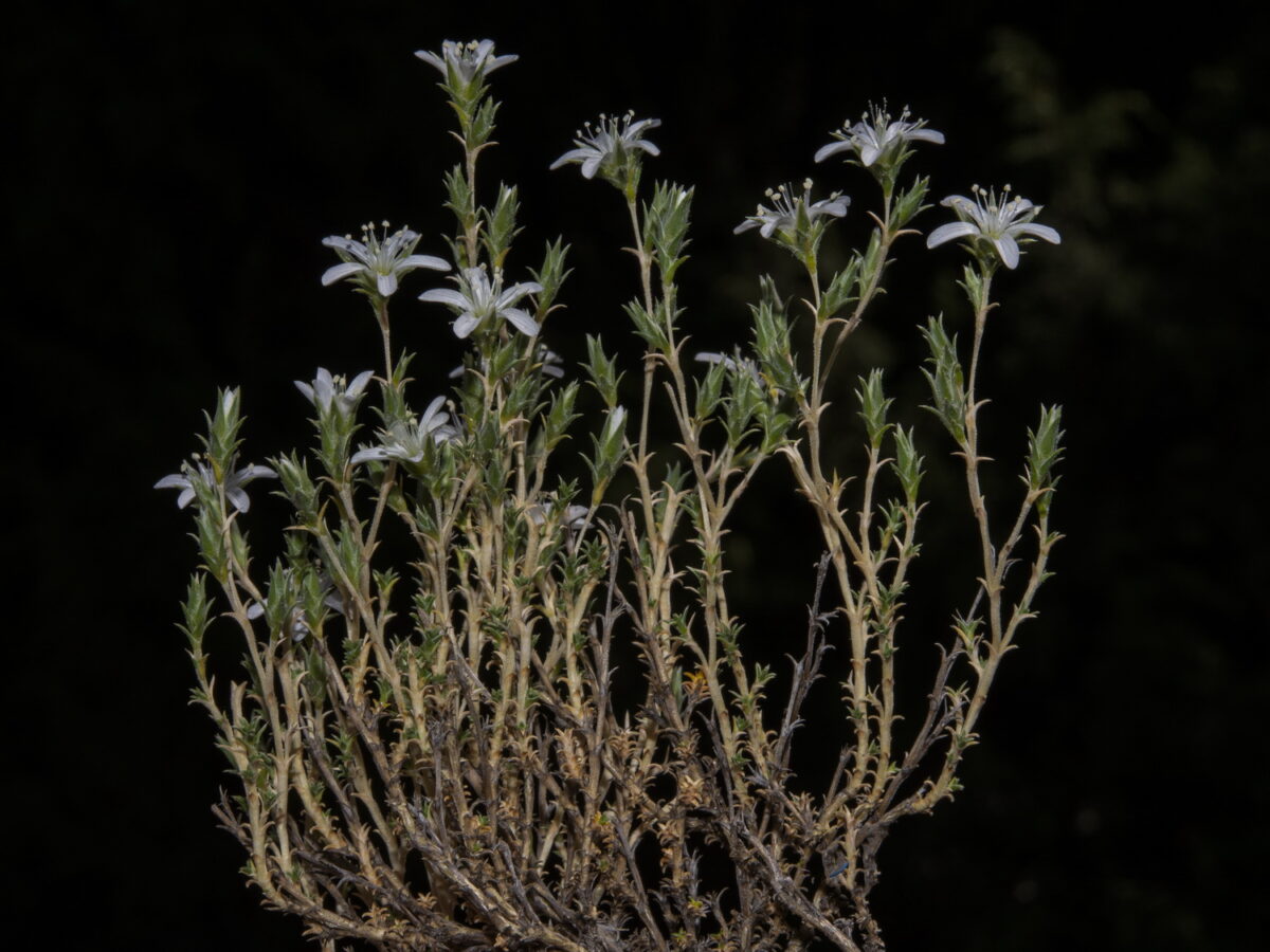 Cepa leñosa gruesa, ramificada. Tallos ramificados, ascendentes o erectos, con entrenudos largos, pubescentes. Hojas 3–6 x 0,5–1,3 mm, opuestas, connadas, linear–lanceoladas u ovado–lanceoladas, subaristadas, trinervadas, con los nervios marginales formando un reborde grueso, arqueadas, glabrescentes, ciliadas en la base. Flores solitarias o en grupos de 2–5, axilares y terminales, formando inflorescencias racemiformes, actinomorfas, hermafroditas, pentámeras. Sépalos 4–8 mm, ovado–lanceolados, agudos, mucronados, rígidos, con margen escarioso ciliado, glabros o pubescentes. Pétalos más largos que los sépalos, enteros, blancos. Estilos 3. Cápsula ligeramente exerta, oblongoidea, con 6 dientes. Semillas reniformes, reticuladas, negras