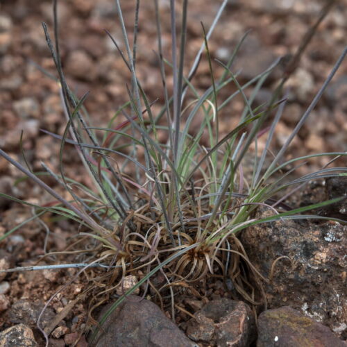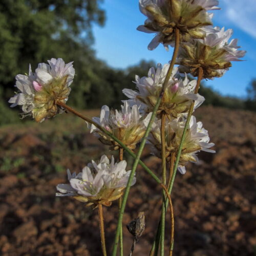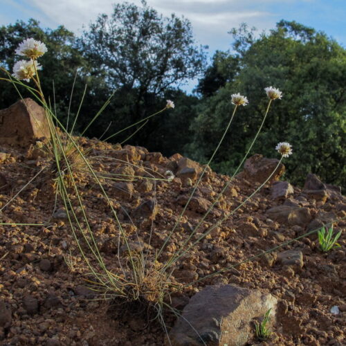 Hojas dimorfas, lineares, uninervadas, ciliadas o escábridas en el nervio; las externas 0,5–2 mm anchura, las internas 0,2–1 mm anchura; margen algo sinuado y ciliado o escábrido; vainas viejas fibrosas. Escapo 23–34 cm. Vaina del involucro 15–20(25) mm. Involucro 8–15(18) mm de diámetro; brácteas pajizas con una banda dorsal parda, alveoladas y rugosas (sobre todo las externas). Brácteas de las espiguillas opacas en la base y escariosas en el resto, más cortas que las brácteas internas del involucro. Flores actinomorfas, hermafroditas, pentámeras. Cáliz 5–7,4 mm, gamosépalo, generalmente con escasa pilosidad sólo en los nervios primarios; nervios gruesos y mucho más oscuros que el limbo; espolón 0,6–1 mm; lóbulos 1,5–2 mm, medianamente aristados. Corola con los pétalos soldados en la base, de color rosado intenso