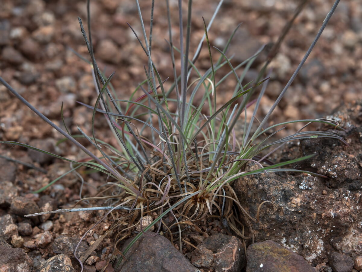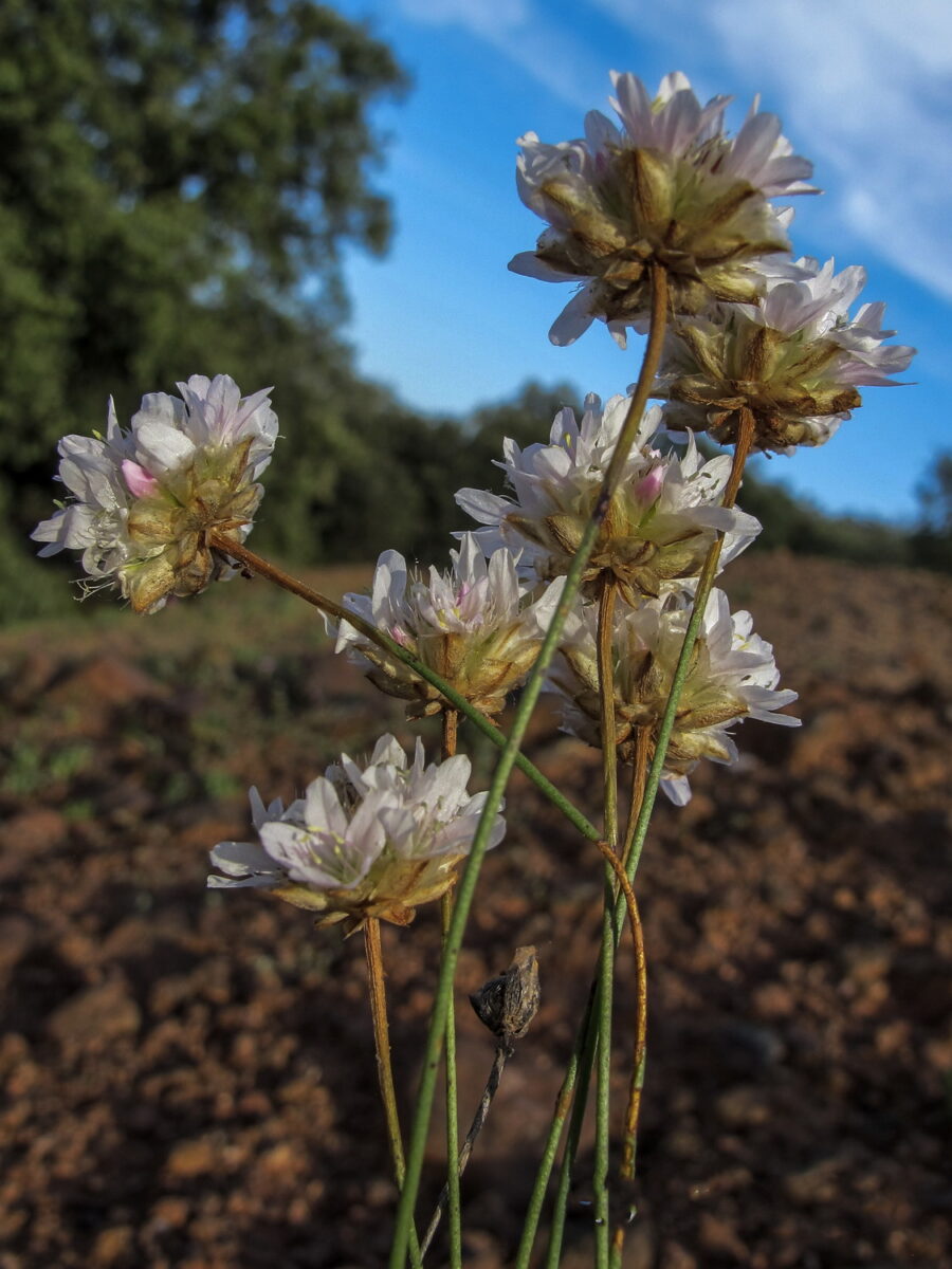 Hojas dimorfas, lineares, uninervadas, ciliadas o escábridas en el nervio; las externas 0,5–2 mm anchura, las internas 0,2–1 mm anchura; margen algo sinuado y ciliado o escábrido; vainas viejas fibrosas. Escapo 23–34 cm. Vaina del involucro 15–20(25) mm. Involucro 8–15(18) mm de diámetro; brácteas pajizas con una banda dorsal parda, alveoladas y rugosas (sobre todo las externas). Brácteas de las espiguillas opacas en la base y escariosas en el resto, más cortas que las brácteas internas del involucro. Flores actinomorfas, hermafroditas, pentámeras. Cáliz 5–7,4 mm, gamosépalo, generalmente con escasa pilosidad sólo en los nervios primarios; nervios gruesos y mucho más oscuros que el limbo; espolón 0,6–1 mm; lóbulos 1,5–2 mm, medianamente aristados. Corola con los pétalos soldados en la base, de color rosado intenso