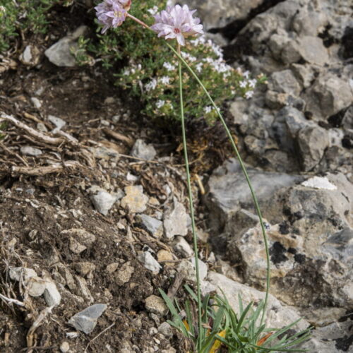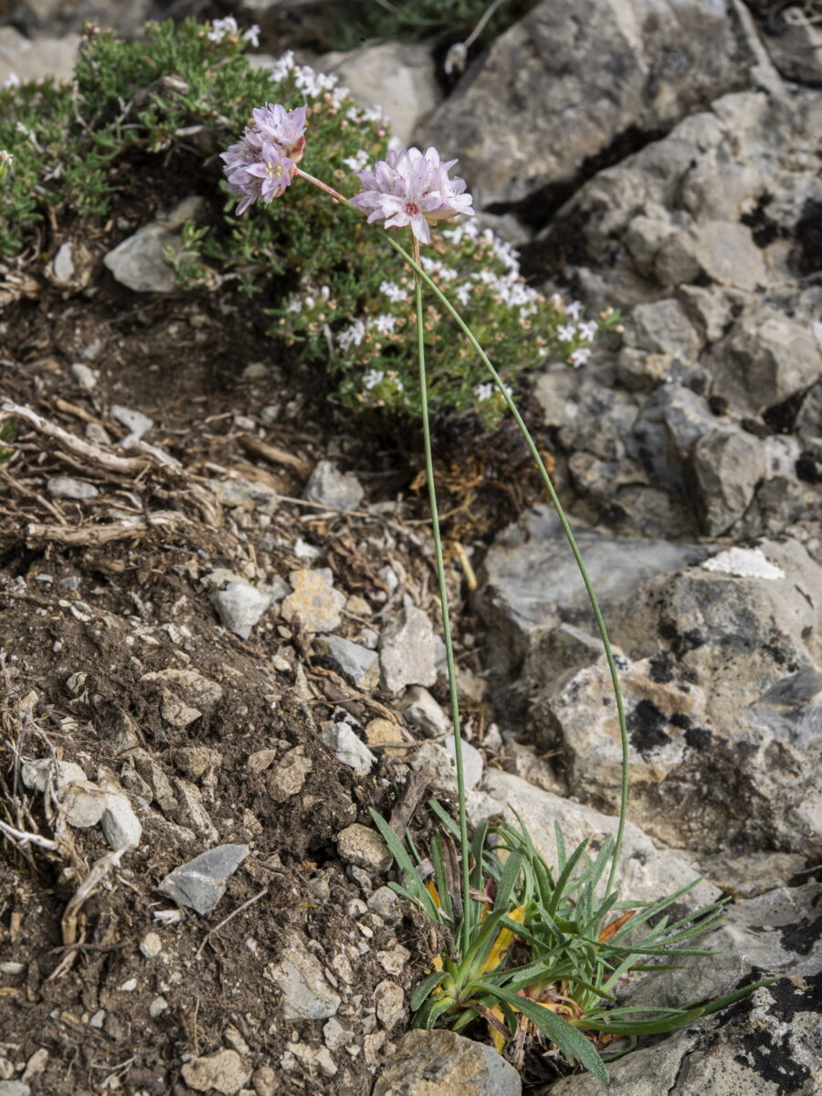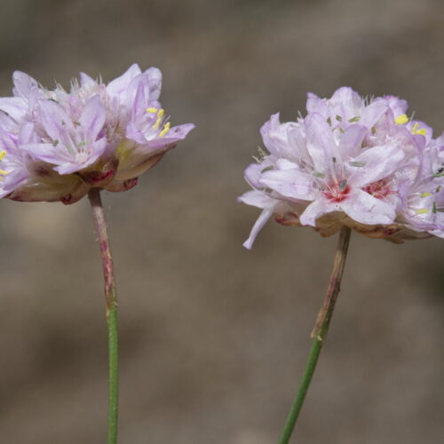 Cespitosa. Hojas dimorfas o casi, lineares, planas o acanaladas, de ciliadas a densamente pubescentes; las externas 1–2,5 mm de anchura, uninervadas (en ocasiones con 2 nervios laterales poco perceptibles); las internas 0,2–1,2 mm de anchura, uninervadas; margen generalmente sinuado, de glabro a densamente pubescente; vainas viejas no fibrosas. Escapo 8–21 cm, algo curvado. Vaina del involucro generalmente < 10 mm. Involucro (10)14–20(22) mm de diámetro; brácteas pajizas, con banda dorsal parda o anaranjada o sin ella. Brácteas de las espiguillas totalmente escariosas, más cortas que las internas del involucro, brácteas del involucro externas claramente más cortas que el resto, cortamente agudas o mucronadas. Flores actinomorfas, hermafroditas, pentámeras. Cáliz (5)5,2–6(10) mm, gamosépalo, con abundante pilosidad en todos los nervios, incluso en los surcos intercostales; espolón 0,3–0,5 mm; lóbulos (0,7)1–1,5 mm, medianamente aristados o sin arista. Corola con los pétalos soldados en la base, rosado–pálida