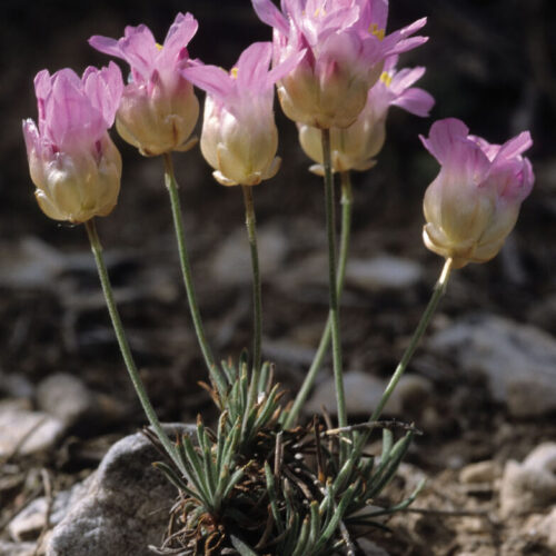 Hojas 0,2–2 mm de anchura, dimorfas o casi, sublineares o lineares, acanaladas, gruesas, agudas, uninervadas (a veces con 2 nervios laterales poco perceptibles), con gránulos blancos, ciliadas o pubescentes, las externas frecuentemente rojizas; margen glabrescente, ciliado o pubérulo, ocasionalmente sinuado; vainas viejas no fibrosas. Generalmente con 1-4 escapos, escapos < 10 cm, ± arqueados. Vaina del involucro 4-10 mm. Involucro 10–20 mm de diámetro; brácteas blanquecinas o pajizas. Brácteas de las espiguillas totalmente escariosas e incoloras; las externas mucho más cortas que las brácteas internas del involucro, brácteas internas del involucro 8–13 mm, oblanceoladas u oblongas, de ápice subagudo o redondeado. Flores actinomorfas, hermafroditas, pentámeras. Cáliz 5–6 mm (incluidas las aristas), gamosépalo, con abundante pilosidad en todos los nervios e incluso en los surcos intercostales; espolón 0,1–0,75 mm; lóbulos 1–2,5 mm, de corta a largamente aristados. Corola con los pétalos soldados en la base, rosada