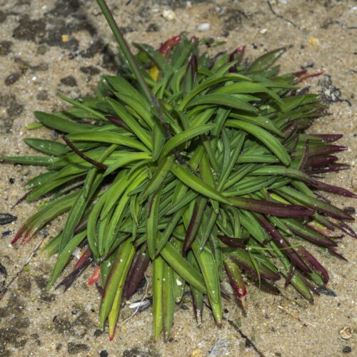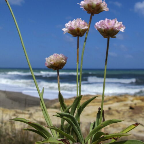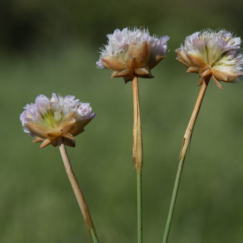 Hojas (30)50–110(160) x 2–6(9) mm, homomorfas o casi, linear–lanceoladas o sublineares, con 1–3 nervios; margen membranáceo estrecho, algo sinuado, glabro o ± cortamente ciliado; vainas viejas fibrosas. Escapo 25–50(60) cm. Vaina del involucro 15–35 mm. Involucro 20–25 mm de diámetro; brácteas pardas, a veces más oscuras en el centro, lisas; las externas algo rugosas longitudinalmente. Brácteas de las espiguillas ausentes o muy reducidas (menos de la mitad de largas que las brácteas del involucro), pardas y escariosas. Flores actinomorfas, hermafroditas, pentámeras. Cáliz 9–12 mm, gamosépalo, generalmente con pilosidad ± dispersa sólo en los nervios primarios; espolón (1)1,5–2 mm; lóbulos 1,5–2,5(3) mm, mucronados o cortamente aristados. Corola con los pétalos soldados en la base, de color rosado intenso, raramente blanca