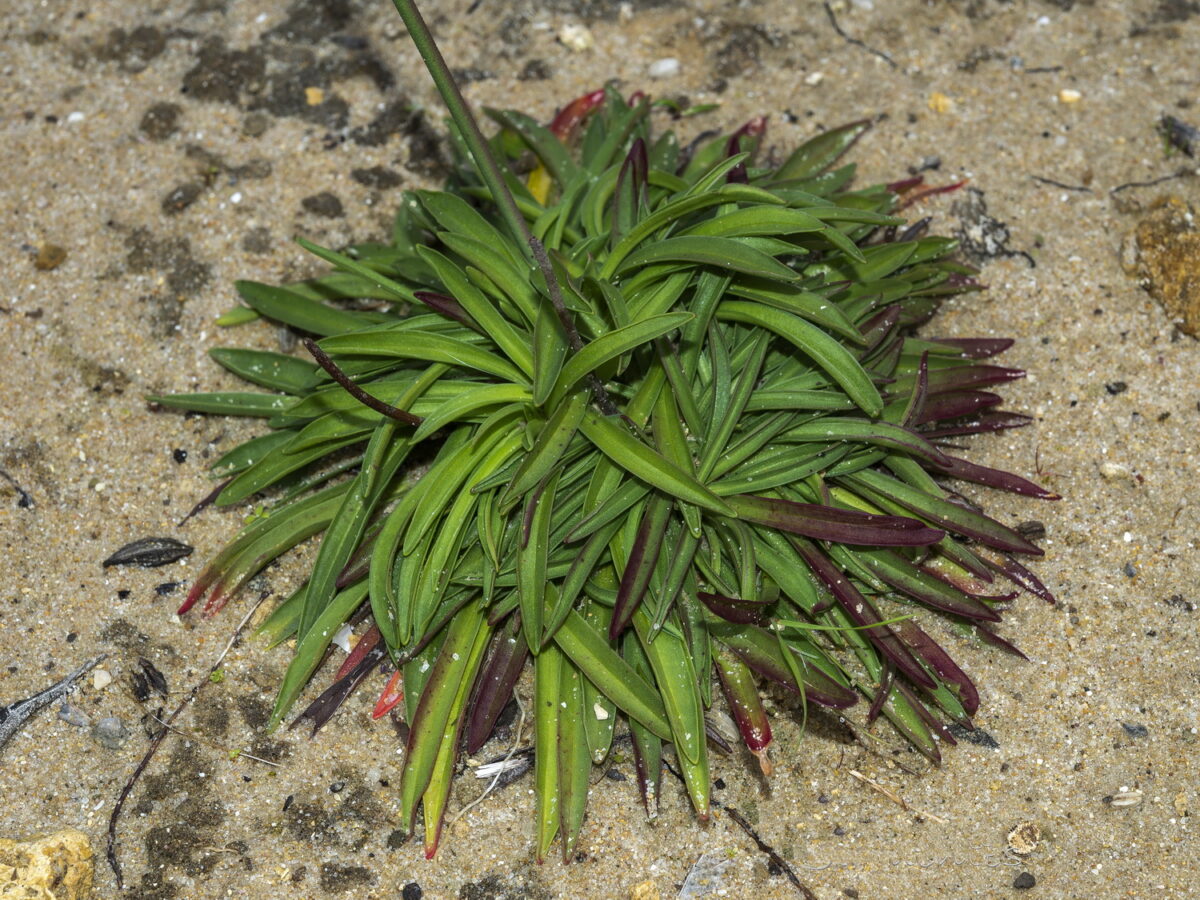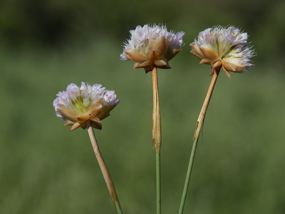 Hojas (30)50–110(160) x 2–6(9) mm, homomorfas o casi, linear–lanceoladas o sublineares, con 1–3 nervios; margen membranáceo estrecho, algo sinuado, glabro o ± cortamente ciliado; vainas viejas fibrosas. Escapo 25–50(60) cm. Vaina del involucro 15–35 mm. Involucro 20–25 mm de diámetro; brácteas pardas, a veces más oscuras en el centro, lisas; las externas algo rugosas longitudinalmente. Brácteas de las espiguillas ausentes o muy reducidas (menos de la mitad de largas que las brácteas del involucro), pardas y escariosas. Flores actinomorfas, hermafroditas, pentámeras. Cáliz 9–12 mm, gamosépalo, generalmente con pilosidad ± dispersa sólo en los nervios primarios; espolón (1)1,5–2 mm; lóbulos 1,5–2,5(3) mm, mucronados o cortamente aristados. Corola con los pétalos soldados en la base, de color rosado intenso, raramente blanca
