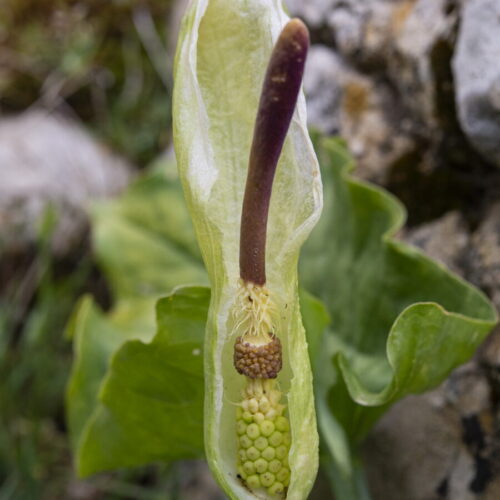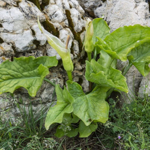 Tuberosa, acaule, glabra; tubérculo subgloboso, algo aplastado dorsiventralmente. Hojas todas basales, largamente pecioladas; limbo hasta 15 cm, sagitado o deltoide. Inflorescencia con pedúnculo de 10–30(40) cm, de longitud igual o más largo que los pecíolos; espata 6–12 cm, abierta hasta la base –donde es tubulosa–, cerrada en la antesis, acuminada, de color verde pálido, a veces con tonalidades purpúreas. Espádice 1/3–1/2 de la longitud de la espata, recto, con la parte apical claviforme, de color purpúreo, inodoro, con flores unisexuales agrupadas en la mitad inferior, arriba las masculinas estériles, luego las masculinas, y las femeninas en la base, separadas por espacios desnudos, todas muy reducidas, sin perianto, sésiles, las femeninas superiores también estériles y contiguas con las fértiles. Infrutescencia epigea, constituida por numerosas bayas globosas, anaranjadas o rojas, mates
