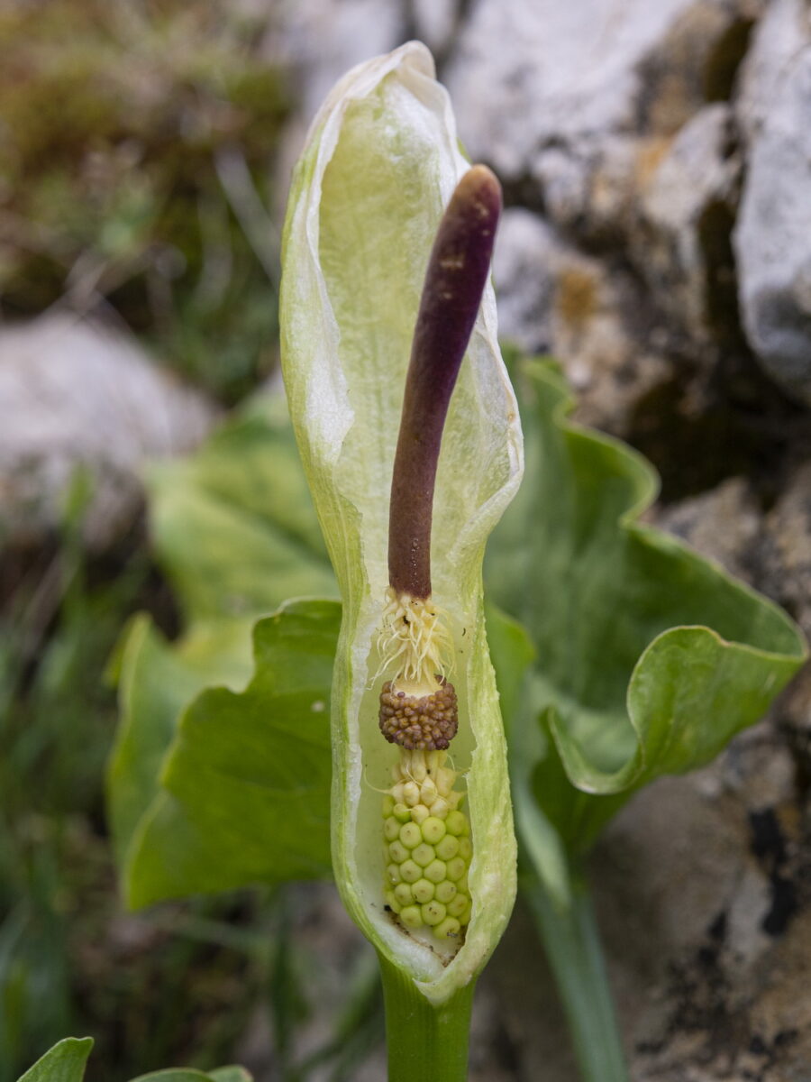 Tuberosa, acaule, glabra; tubérculo subgloboso, algo aplastado dorsiventralmente. Hojas todas basales, largamente pecioladas; limbo hasta 15 cm, sagitado o deltoide. Inflorescencia con pedúnculo de 10–30(40) cm, de longitud igual o más largo que los pecíolos; espata 6–12 cm, abierta hasta la base –donde es tubulosa–, cerrada en la antesis, acuminada, de color verde pálido, a veces con tonalidades purpúreas. Espádice 1/3–1/2 de la longitud de la espata, recto, con la parte apical claviforme, de color purpúreo, inodoro, con flores unisexuales agrupadas en la mitad inferior, arriba las masculinas estériles, luego las masculinas, y las femeninas en la base, separadas por espacios desnudos, todas muy reducidas, sin perianto, sésiles, las femeninas superiores también estériles y contiguas con las fértiles. Infrutescencia epigea, constituida por numerosas bayas globosas, anaranjadas o rojas, mates