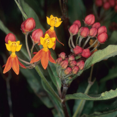 Mata o arbustillo. Hojas 4–8 x 0,7–1,4 cm, perennes, opuestas, simples, estrechamente lanceoladas, enteras, agudas, adelgazadas hacia la base. Flores 8–12 mm de diámetro, actinomorfas, hermafroditas, pentámeras, en umbelas axilares o terminales pubescentes; pedúnculos 10–35 mm, pedicelos 8–25 mm; pétalos 7–8 x 2,8–3 mm, poco soldados en la base, lanceolados, reflexos en la antesis, purpúreos; corona anaranjada, de 5 segmentos, cada uno con un apéndice interno; estambres unidos al gineceo. Folículo 5–10 x 0,6–1 cm, fusiforme, liso; semillas con penacho de pelos sedosos de 4–6 mm