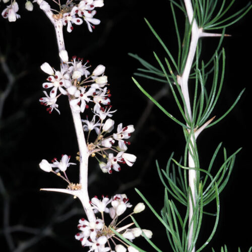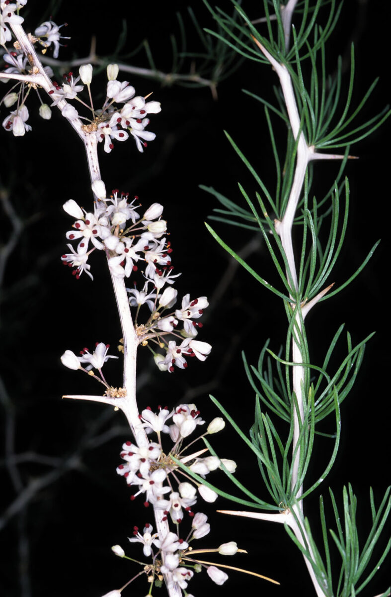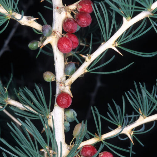 Raíces tuberiformes. Tallos ramificados, leñosos, espinosos, intrincados, ligeramente zigzagueantes, lisos o estriados, pardo–grisáceos o generalmente blancos. Espolones 4–13 mm, leñosos, espinosos, patentes. Cladodios (3)7–25(30) x 0,5–1 mm, en fascículos de (3)5–20(40), lineares, inermes, caducos en verano (VI–IX). Nudos con (3)5–16(20) flores. Pedicelos 5–8 mm, articulados por debajo de la mitad. Flores actinomorfas, hermafroditas, trímeras. Tépalos 6, de 2,5–3 mm, unidos en la base, con un nervio central, blanco–amarillentos. Estambres 6; ovario súpero. Bayas 4–6 mm, rojas, con 1–2 semillas