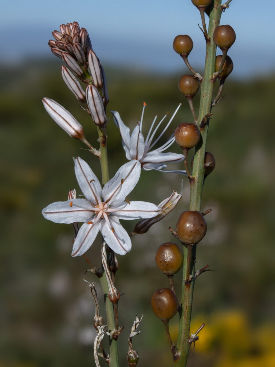 Rizoma corto y grueso, con abundantes restos fibrosos. Raíces con tubérculos fusiformes. Hojas 50–70 x 1–3 cm, dísticas, planas, aquilladas, verdes. Escapo ramificado en la parte superior, con 3–10 ramas erecto–patentes, generalmente simples. Brácteas 7–16 mm, ovadas u ovado–lanceoladas, acuminadas, con la parte central pardo oscura y margen blanquecino. Pedicelos 8–15 mm, erectos o algo curvados, articulados hacia la mitad. Flores actinomorfas, hermafroditas, trímeras. Tépalos 6, de 15–20 x 4–9 mm. Estambres 6, algo más cortos que los tépalos. Ovario súpero. Cápsula 8–12 x 7–10 mm, ovoidea, ovoideo–elipsoidea o elipsoidea, con la parte superior estrechada, de ápice truncado y ligeramente umbilicado, con 5–11 nervios transversales. Semillas 6–8 x 3–4 mm, grises