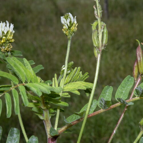 Sin ramificaciones o ramificada en la base o en la parte superior, con indumento de pelos basifijos hasta de 1 mm. Tallos engrosados, hasta de 5(7) mm de diámetro. Hojas 4–14(18) cm, imparipinnadas, con 6–13 pares de folíolos enteros; estípulas 7–15 mm, verdosas; folíolos 6–25(30) x 3–10 mm, de estrechamente ovados a estrechamente obovados, emarginados, de haz glabro y envés esparcidamente peloso. Inflorescencias en racimo, con 2–12 flores papilionadas; pedúnculo 2–12 cm. Cáliz (4)6–8 mm, tubular, con pelos negros o con pelos negros y blancos; dientes 3–4 mm, iguales. Corola blanquecina o amarillenta; estandarte 8–11(14) mm, más largo que las alas y la quilla; alas más largas que la quilla. Estambres 10, diadelfos. Legumbre 20–35(60) x 6–9 mm, ± erecta, sentada, bilocular, con pico recurvo, trígona en sección transversal, aquillada en el vientre y con el dorso cóncavo; valvas rugosas, esparcidamente pelosas