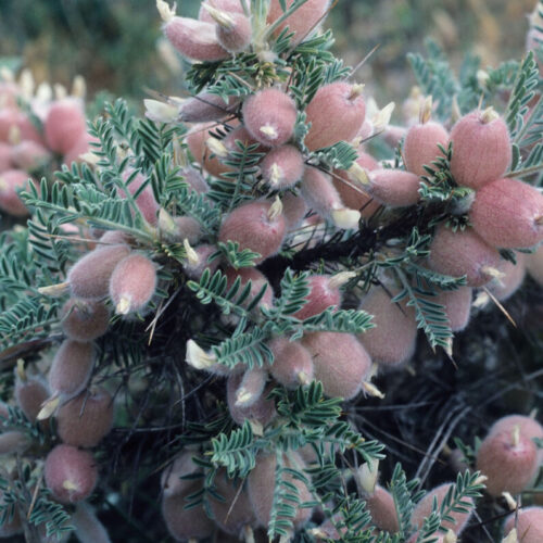 Espinosa, muy ramificada desde la base, con indumento denso, algodonoso cuando jóvenes, de pelos basifijos, blancos. Hojas 0,4–7 cm, paripinnadas, con 4–8 pares de folíolos enteros, con el raquis terminado en espina; estípulas 4–9 mm, cortamente soldadas al pecíolo, que abrazan al tallo; folíolos 3–11 x 1–4 mm, elípticos, pelosos. Inflorescencias en racimo, axilares, sentadas, con (1)2(3) flores papilionadas. Cáliz 14–18 mm, tubular en la floración, alcanzando hasta 26 mm e inflado y globoso en la fructificación, con nerviación reticulada, cubierto de pelos densos; dientes 3,5–6 mm. Corola amarillenta, blanco–amarillenta o algo rosada, marcescente, con los pétalos soldados al tubo estaminal; estandarte 18–24 mm; alas casi de la longitud del estandarte o algo más cortas; quilla más corta que las alas. Estambres 10, diadelfos. Legumbre 5–6(7) x 1,5–2,5(3) mm, con carpóforo de 2–4 mm, ovoidea o subcilíndrica, unilocular, serícea, encerrada en el cáliz acrescente