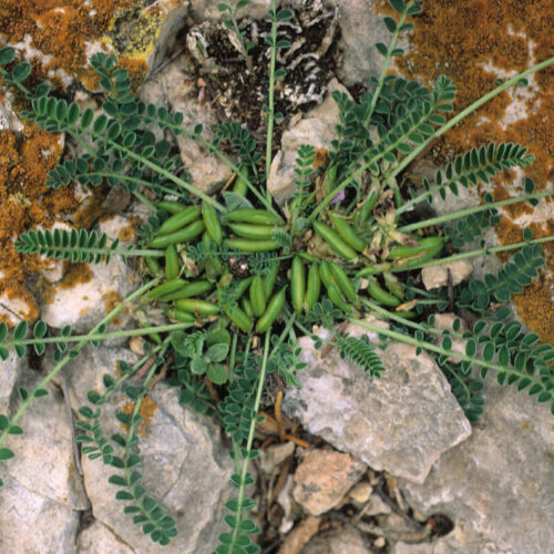 Acaule o con tallos muy cortos; indumento denso de pelos basifijos, blancos. Hojas 0,5–5 cm, imparipinnadas, con 5–15 pares de folíolos enteros; estípulas 3–10 mm, membranáceas, libres entre sí, no soldadas al pecíolo; folíolos 2–10 x 1,5–7 mm, ovados o anchamente ovados, redondeados o emarginados en el ápice, de haz glabro y con pelos adpresos por el envés. Inflorescencias en racimo, pedunculadas, con 6–25 flores papilionadas, laxas o densas; pedúnculo 0,3–2 cm. Cáliz 4–7,5 mm, anchamente campanulado–tubular, con pelos adpresos blancos y negros; dientes desiguales. Corola blanquecina o con la quilla azulada; estandarte 10–12 mm; alas y quilla de longitud parecida, más cortas que el estandarte. Estambres 10, diadelfos. Legumbre 6–18 x 2,5–3(4) mm, recta, patente o ± péndula, casi cilíndrica, acuminada en la base y ápice, pelosa cuando inmadura, después glabrescente, incompletamente bilocular, con numerosas semillas