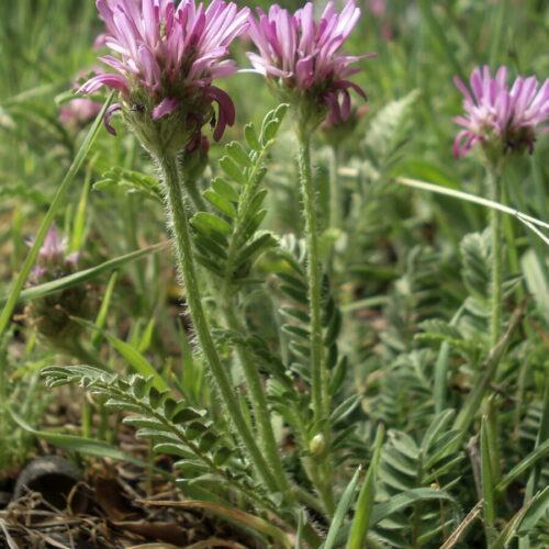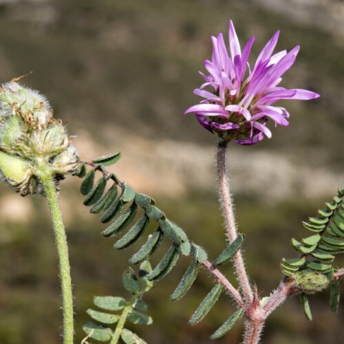 Ramificada en la base, con indumento denso formado por pelos basifijos, blancos. Hojas 2–5(6) cm, imparipinnadas, con (8)11–15 pares de folíolos enteros; estípulas(4)5–11 mm, verdosas, soldadas al pecíolo y entre sí, que abrazan al tallo; folíolos 2–9 x 0,8–3,5 mm, estrechamente elípticos, rara vez más anchos, de haz glabro o poco peloso y envés peloso. Inflorescencias en racimo, subglobosas, con numerosas flores papilionadas densamente dispuestas; pedúnculos (1,5)5–11 cm. Cáliz 4–6 mm, campanulado; tubo con pelos blancos; dientes ± iguales, con pelos negros. Corola rosada o azulada; estandarte 9–13(17) x c. 3 mm; alas más cortas que el estandarte y más largas que la quilla. Estambres 10, diadelfos. Legumbre 7–10(15) x 3–4 mm, sentada, gibosa en la base, trígona, con un pico ganchudo, aquillada en el vientre y surcada en el dorso, con pelos densos y patentes, bilocular, con 1 semilla por lóculo