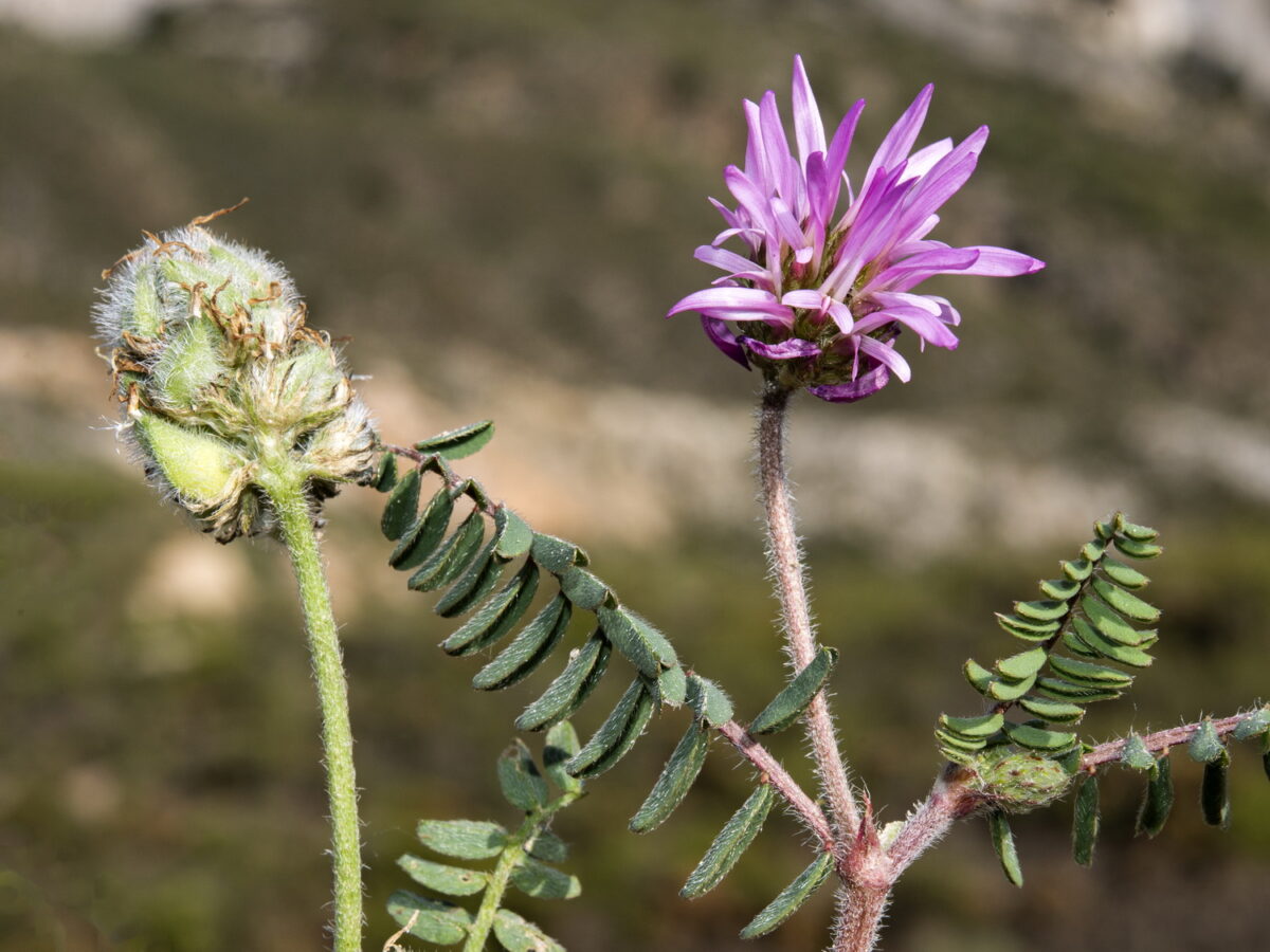 Ramificada en la base, con indumento denso formado por pelos basifijos, blancos. Hojas 2–5(6) cm, imparipinnadas, con (8)11–15 pares de folíolos enteros; estípulas(4)5–11 mm, verdosas, soldadas al pecíolo y entre sí, que abrazan al tallo; folíolos 2–9 x 0,8–3,5 mm, estrechamente elípticos, rara vez más anchos, de haz glabro o poco peloso y envés peloso. Inflorescencias en racimo, subglobosas, con numerosas flores papilionadas densamente dispuestas; pedúnculos (1,5)5–11 cm. Cáliz 4–6 mm, campanulado; tubo con pelos blancos; dientes ± iguales, con pelos negros. Corola rosada o azulada; estandarte 9–13(17) x c. 3 mm; alas más cortas que el estandarte y más largas que la quilla. Estambres 10, diadelfos. Legumbre 7–10(15) x 3–4 mm, sentada, gibosa en la base, trígona, con un pico ganchudo, aquillada en el vientre y surcada en el dorso, con pelos densos y patentes, bilocular, con 1 semilla por lóculo