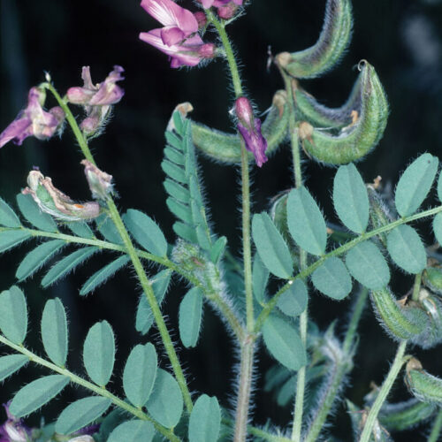 Ramificada desde la base, con indumento denso de pelos hasta de 2,5 mm, rígidos, basifijos, adpresos y semipatentes. Hojas 2–10(12) cm, imparipinnadas, con 5–9 pares de folíolos enteros; estípulas 5–7 mm, verdosas, soldadas a la base del pecíolo; folíolos 4–22 x 2–12 mm, estrechamente ovados u ovados, emarginados, de haz glabro y envés con escasos pelos. Inflorescencias en racimo, alargadas y laxifloras, con numerosas flores papilionadas subsentadas, frecuentemente bracteadas; pedúnculo 3–10(12) cm. Cáliz 5–8 mm, campanulado, con pelos negros; dientes 3–5 mm, iguales. Corola violeta, a veces blanco–amarillenta; estandarte 11–14 mm, más largo que las alas y la quilla. Estambres 10, diadelfos. Legumbre 18–25(30) x 4–5 mm, sentada, falcada, subcilíndrica, con pelos patentes, la mayoría de base tuberculada