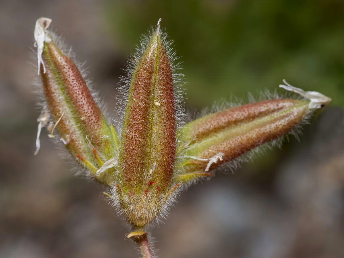 Ramificada en la base, con indumento denso de pelos basifijos de 0,5–2(2,5) mm, patentes, blancos, y también negros en estípulas e inflorescencias. Hojas 2–7 cm, imparipinnadas, con 6–9 pares de folíolos enteros; estípulas 5–7 mm, verdosas, soldadas ligeramente al pecíolo, libres entre sí o a veces unidas por detrás del tallo; folíolos 3–9 x 1,5–3,5 mm, elípticos, obovados o estrechamente ovados, más raramente redondeados, emarginados, de haz laxamente pubescente, glabrescente o glabro y envés densamente peloso. Inflorescencias en racimo, bracteadas, con 2–5 flores papilionadas; pedúnculo 1,5–4 cm. Cáliz 7–9 mm, tubular–campanulado; dientes 2–3 mm, ± iguales. Corola de color violeta pálido o púrpura claro; estandarte 13–20 mm, estrechamente elíptico–rómbico, acabado en pico ± mucronado; alas y quilla más cortas que el estandarte. Estambres 10, diadelfos. Legumbre 20–32 mm x 4–8 mm, sentada, erecta, linear, semi–septada, aquillada en el vientre y surcada en el dorso, con un pico recto de 1–2 mm, esparcidamente pelosa