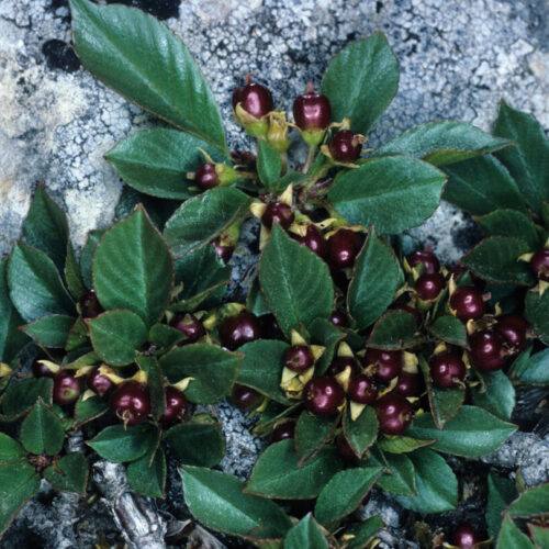 Decumbente, con ramas y ramillas alternas, no espinosas, glabras. Hojas 15–30 x 11–15 mm, alternas, caducas, de obovadas a elípticas, de margen serrulado, cortamente pecioladas, glabras, no coriáceas, con 4–9(13) pares de nervios laterales arqueados. Inflorescencias en fascículos o racimos axilares. Flores pequeñas, unisexuales, con pedicelo de 1–3 mm y envuelta acopada (hipanto); cáliz 1,3–2 x 0,9–1,3 mm, con 4 sépalos triangulares, verde–amarillentos, soldados en la base; corola ausente; estambres 4; ovario súpero, con 2–4 cavidades. Fruto drupa, de 2,5–3,5 mm, globoso, verde o algo rojizo, con 2–4 huesecillos