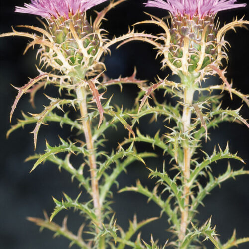 Matilla rizomatosa, de base algo leñosa, espinosa, ± flocoso–lanuginosa. Tallos simples, erectos, monocéfalos. Hojas alternas, coriáceas, oblongas o lineares, pinnatipartidas, con lóbulos fuertemente espinosos; las involucrantes arqueadas hacia fuera, de ápice foliáceo, mucho más largas que el involucro. Capítulos radiados, terminales, solitarios; involucro 20–25 x 12–25 mm; brácteas medias de ápice truncado, flocoso–lanuginoso, con espina apical de 4–5 mm; receptáculo paleáceo. Flores rosadas o purpúreas, las externas liguladas, las internas flosculosas. Aquenios 3–5 mm, obovoideos, densamente seríceos, con pelos de longitud doble a la del cuerpo; vilano 10–13 mm, de setas plumosas soldadas en la base formando un anillo viloso