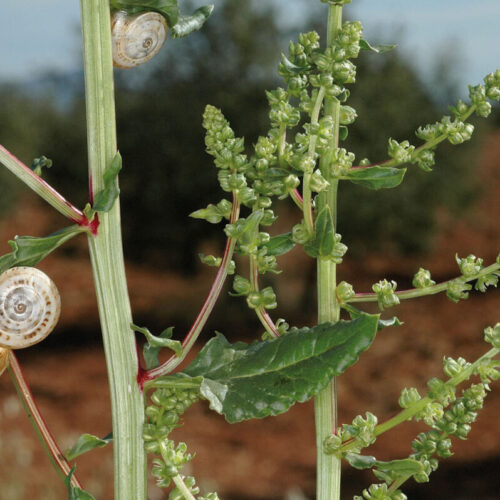 Anual o bienal, herbácea, glabra. Tallos erectos, engrosados. Hojas 10–20 x 5–15 cm, alternas, pecioladas, cordado–ovadas o rómbicas, lustrosas. Inflorescencias en cimas axilares dispuestas en espigas terminales, muy largas y ramificadas, sin brácteas en su mitad superior. Flores actinomorfas, hermafroditas, pentámeras. Perianto 1,5–3 mm de diámetro, compuesto de tépalos verdosos o rojizos, erecto–patentes, acrescentes, que en la fructificación aparecen fuertemente aquillados y de ápice incurvo. Estambres 5, que parten de un disco basal carnoso. Frutos pixidios, reunidos en grupos y soldados en la base, con 1 semilla horizontal